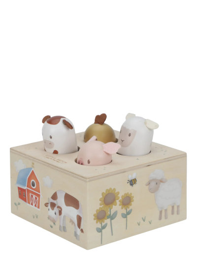 Vad händer, lilla bonde?! De här fyra bondgårdsdjuren är redo att leka. Med en lätt knuff hoppar ett djur in och det andra hoppar ut. Upptäck alla djuren och matcha deras ljud: kons mjuka moo, fårets mjuka baa, grisens oink och kycklingens kluckande. Den robusta trälådan med denna interaktiva pop-up leksak är utsmyckad med vänliga illustrationer av Little Farm, utformade för att fånga fantasin hos ditt lilla barn. De uppmuntrande djurljuden och de roliga popup-rörelserna hos djurhuvudena ger fantastisk underhållning och hjälper till att förbättra kognitiva förmågor på ett lekfullt sätt.