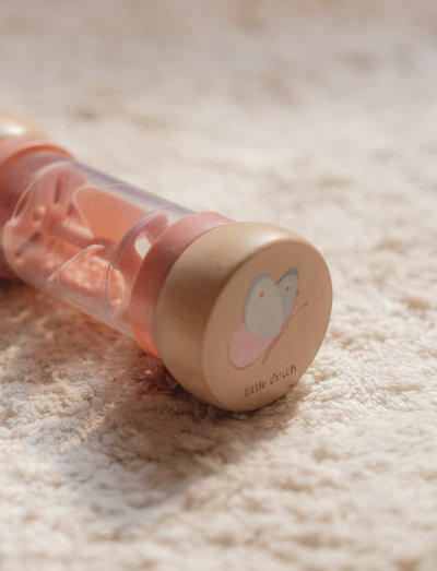 Skaka och skramla! Vrid på regnskallran och lyssna på det lugnande ljudet av kulorna som rör sig från den ena sidan av regnmakaren till den andra. Det stimulerar den sensoriska utvecklingen och musikaliska talangen hos ditt barn. Bollarna faller genom små öppningar i röret och roterar propellern, vilket resulterar i ett behagligt ljud. Regnskallran är utformad för små händer och är bekväm att hålla i. Över- och underdelen i trä är dekorerade med en illustration av en blomma och en fjäril från Fairy Garden-kollektionen.