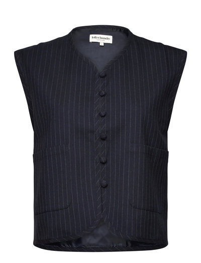 En tidlös kritstrecksrand definierar denna klassiska väst, vilket ger en touch av raffinerad coolhet till varje ensemble. Den har en rund halsringning, kompletterad med en knappstängning fram med tygklädda knappar och fina elastiska öglor. Två framfickor ger en praktisk touch. Bär den lager på lager över skjortor eller klänningar, eller para ihop den med matchande byxor för en modern tolkning av kostymen.