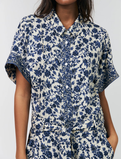 Denna skjorta har ett vackert blommönster och en avslappnad, feminin stil. Den dekorativa kanten längs fållen ger en speciell touch. Den lösa passformen och de korta ärmarna skapar en ledig look, perfekt för både vardag och semester.