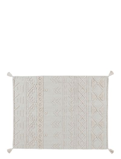 Rectangular cotton rug with visible melange color canvas base in Natural and Soil Brown, with tribal design pattern on top in Natural color. Finished with a tassel in each corner