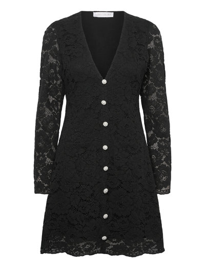 Denna miniklänning är tillverkad av delikat spets och ger en touch av elegans med sina halvtransparenta ärmar och dekorativa pärlknappar. Den lätt figursydda midjan framhäver silhuetten, vilket gör den idealisk för kvällsevenemang och speciella tillfällen.