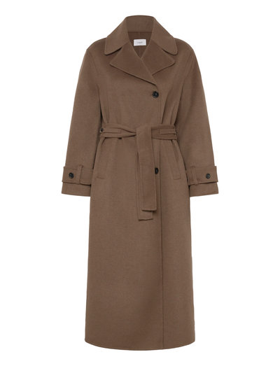 Denna långa kappa är skapad för en smickrande silhuett och har ett matchande bälte som kan spännas i midjan. Designen har en klassisk krage och knappstängning, vilket ger mångsidiga stylingmöjligheter. Den är avslutad med subtila ärmdetaljer som ger en raffinerad touch till varje outfit.