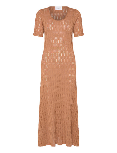 Denna stickade midiklänning passar för alla tillfällen. Designen inkluderar en djup, rund halsringning och korta ärmar, vilket ger en modern, feminin touch. Den är figursydd i midjan och har en fin vidd nedtill, vilket skapar en smickrande silhuett.