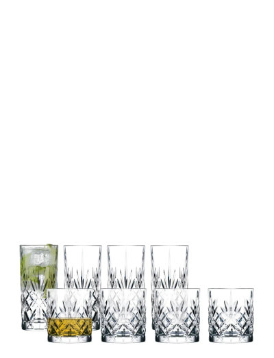 Setet innehåller 4 Melodia whiskyglas (31 cl) och 4 Melodia highballglas (36 cl). Denna retromoderna glasserie framhäver dryckens nyanser när ljus och skuggor från omgivningen reflekteras i kristallglasets vackra mönster.