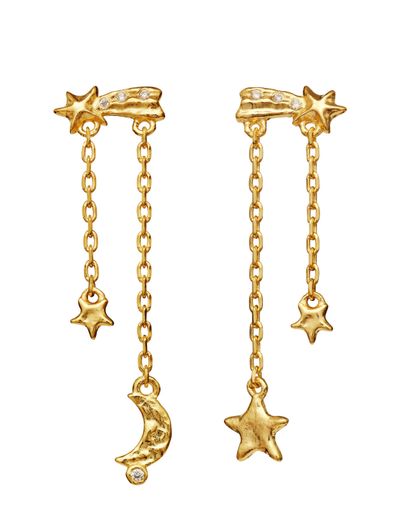 The Amaya earrings drip with golden moons and stars on the nightly sky, whether worn in light of day or in the shades of the night.