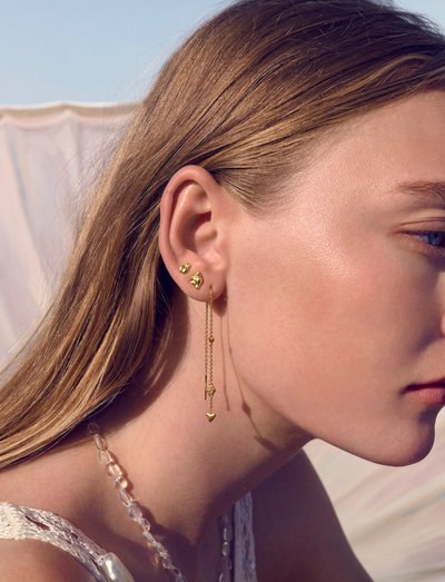 Dessa örhängen är ett vackert och delikat smycke. De har en lång kedja med en hjärtacharm i botten och en liten diamantformad charm i mitten. Örhängena är perfekta för att lägga till en touch av elegans till vilken outfit som helst.
