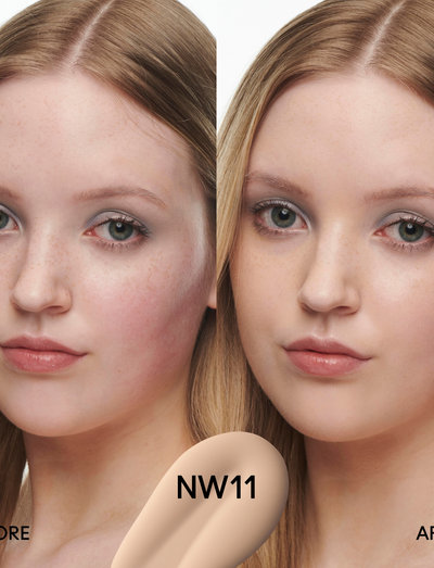 Serumet i denna foundation skapar fantastisk lyster. Upplev en foundation med serum som kombinerar vår expertis om hudtoner med hudvårdsforskning. Denna helt nya innovation ger +209 % återfuktning för en fylligare, smidigare och mer strålande hud. Vår banbrytande foundation ger också huden en återfuktad och hälsosammare som strålar av lyster hela dagen. Den innehåller en 80-procentig hudvårdsbas med 33 hudvårdsingredienser som en 10-procentig hyaluronsyralösning som binder fukten under hudytan. Den är också berikad med en cocktail av kraftfulla superfoods som vårdar huden, bland annat oliv- och jojobaolja som vårdar huden för att ge dem hälsosam lyster, plus E-vitamin som skyddar huden mot föroreningspartiklar och blått ljus. Studio Radiance Serum-Powered™ Foundation återfuktar i 24 timmar och ger en medium uppbyggbar täckningsgrad som omedelbart jämnar ut hudtonen. Denna lätta foundation tonar också ned porer, rodnad, mörka fläckar och fina torrhetslinjer. Skapa skräddarsydd lyster med denna foundation utvecklad av makeupartister med pärlemorskimrande silver- och guldpartiklar som är särskilt framtagna för att komplettera unika undertoner av ljus och mörk hud. Finns i 56 nyanser så att du kan hitta en som passar just dig. Den återvinningsbara glasflaskan är tillverkad med hållbarhet i åtanke och har en kork tillverkad av 30 % PCR. •+209 % omedelbar återfuktning* för fylligare, smidigare och mer strålande hud