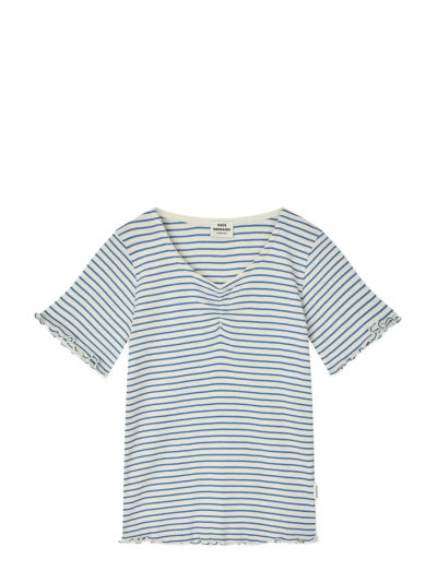 Denna t-shirt är tillverkad av mjuk, ribbad ekologisk bomull och har en smickrande V-ringning och fina volangdetaljer. Den lösa passformen säkerställer komfort hela dagen.