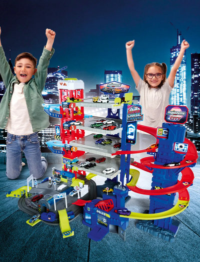 Majorette Super Chase Center med 5 bilar. Ett imponerande garage med 6 nivåer, motoriserad hiss, ljus och ljud. Setet inkluderar 4 metall bilar (7,5 cm) och 1 batteridrivet tåg, samt en polisstation med en fälla. Garaget har 56 parkeringsplatser och är 112 x 70 x 84 cm stort.