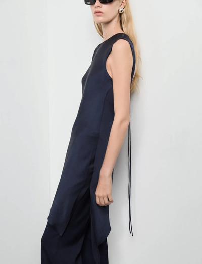 Denna långa topp är tillverkad av slätt satin och har en iögonfallande, asymmetrisk fåll. Designen inkluderar en klassisk rund hals, breda axelband och en förförisk öppen rygg med knytning. En mångsidig modell för att skapa en komplett look.