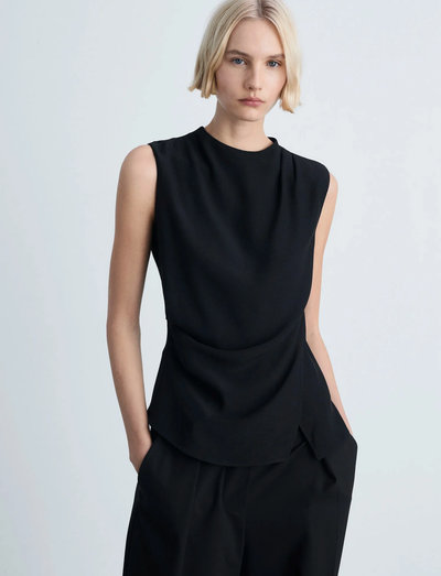 Den här ärmlösa draperade blusen är ett snyggt och mångsidigt plagg som kan stylas upp eller ner. Den har en avslappnad passform och en smickrande draperad halsringning. Blusen är gjord av ett mjukt och bekvämt tyg som draperar vackert.