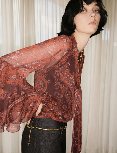 Denna blus är tillverkad av lättviktsmaterial och har en hög omlottkrage och långa ärmar. Den smala silhuetten och den figurnära designen skapar en smickrande form, medan knäppningen baktill ger en sömlös look. De böljande ärmarna ger en elegant touch.
