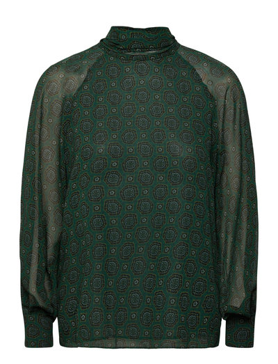 Denna blus är tillverkad i ett halvtransparent tyg och har en sofistikerad hög halsringning och långa ärmar med knäppta manschetter. Den raka designen förstärks av ett allover-tryck och en charmig knytning i nacken, medan ett innerfoder säkerställer en bekväm passform.