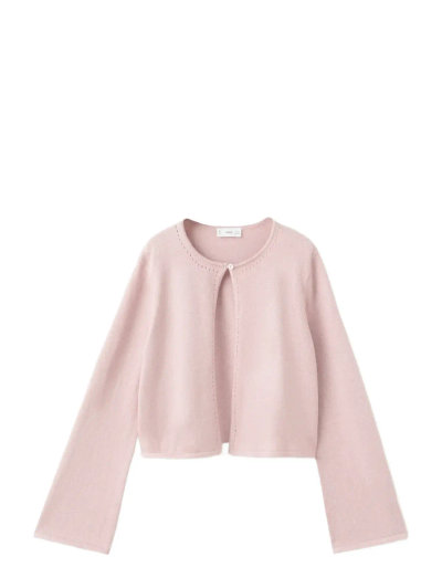 Denna finknitcardigan är tillverkad av en mjuk bomullsblandning och har en rak design i mediumlängd. Den har en rund hals med knappstängning och långa, utsvängda ärmar som ger en elegant touch. De genombrutna detaljerna förstärker dess attraktionskraft, vilket gör den lämplig för fester, ceremonier och kommunioner.