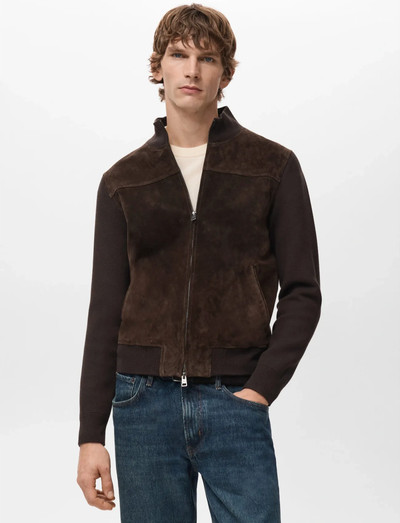 Denna jacka är tillverkad av ren mocka och har en normal passform och en kontrasterande stickning. Den har en hög krage, ribbade kanter och två sidfickor. Dragkedjan fram och den ribbade fållen bidrar till den klassiska bomberstilen.