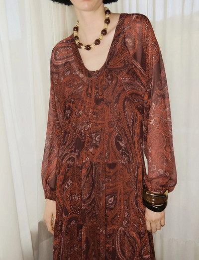 Denna långärmade maxiklänning är tillverkad i ett halvtransparent tyg och har en A-linje silhuett för en böljande, oversized passform. Designen har en låg halsringning, en frontknäppning och långa ärmar med puffärmar, kompletterat med ett innerfoder och ett paisleytryck över hela klänningen.