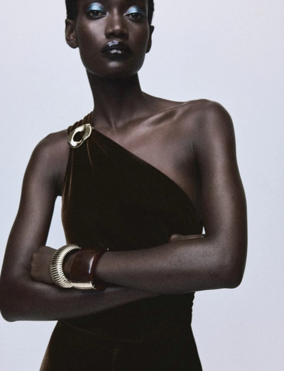 Denna jumpsuit är tillverkad av mjuk sammet och designad med speciella tillfällen i åtanke. Den långa, figursydda silhuetten har en asymmetrisk halsringning, metalliska detaljer och stilfulla sidovolanger. En sidodragkedja säkerställer en smidig passform, vilket gör den till ett elegant val för fester och evenemang.