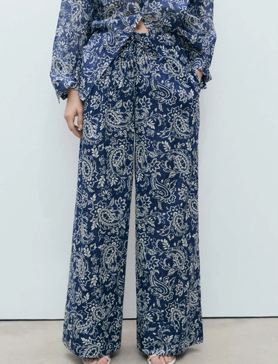 Dessa långa byxor är tillverkade i ren bomull och har ett slående paisley- och abstrakt bladtryck. Designen har en bekväm elastisk midja och praktiska sidfickor, vilket gör dem idealiska för vardagsbruk.