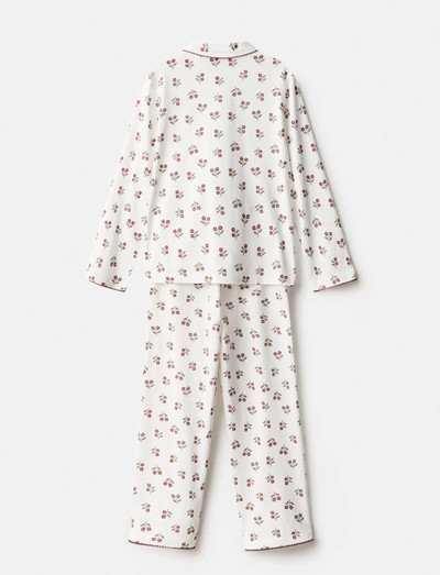 Det här pyjamassetet har ett charmigt blommönster och inkluderar en långärmad överdel med krage och knäppning framtill, plus matchande underdelar med resår i midjan för en bekväm passform. Överdelen har en påsydd ficka och fina broderade detaljer.