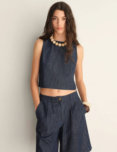 Denna ärmlösa topp är tillverkad i mjuk bomull i denimstil och har en smickrande, croppad design. Den raka silhuetten kompletteras av en rund hals och en knappstängning baktill, vilket gör den idealisk för att skapa en komplett look.