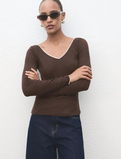 Denna långärmade topp ger en strömlinjeformad silhuett och har en smickrande V-ringning. Den figurnära designen har ett kombinerat tyg för en subtil texturkontrast, vilket gör den till ett mångsidigt tillskott till din garderob.