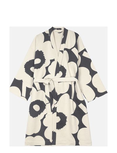 Denna morgonrock är tillverkad av bomullsvåffla i Unikko-mönster. Badrocken har långa, lösa ärmar som har breda uppvik i ärmsluten. Badrocken i kimonostil har fickor i sidosömmen och ett avtagbart bälte.Marimekkos berömda vallmomönster Unikko föddes 1964 i en tid då designhusets kollektioner mest bestod av abstrakta mönster. Designern Maija Isola ville skapa något intressant av detta organiska tema och designade en hel serie med blommönster. I dag representerar den ikoniska blomman kreativitet.