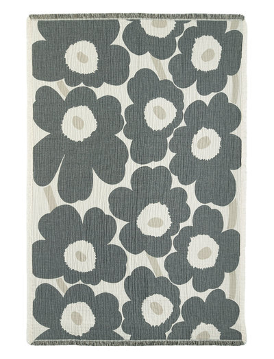 BomullThe Unikko pattern blanket is made of organic cotton with a jacquard knit. The blanket has short fringes on all sides. The pattern’s colors are reversed on the other side of the blanket.
