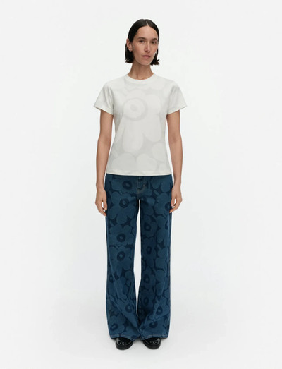 Denna topp är tillverkad av mjuk ekologisk bomullsjersey och har en smal, rak passform som smickrar figuren. De korta ärmarna och den ribbstickade O-halsen ger klassiska detaljer, medan det genomgående blommönstret säkerställer en iögonfallande look. Varje plagg är unikt på grund av tygets skärning.
