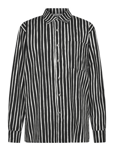Denna långärmade skjorta har ett djärvt randigt mönster och en oversized passform med ett rakt snitt till höften. Den är tillverkad av ekologisk bomull och har en påsydd bröstficka, metallknappar fram och på manschetterna samt diskreta sidoslitsar för extra komfort.