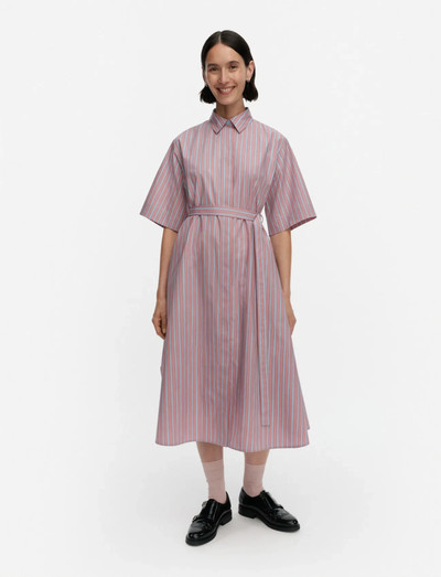 Denna skjortklänning har ett randigt mönster och en avslappnad A-linje silhuett. Den är tillverkad av ekologisk bomullspoplin och har en spetsig krage, dold knappstängning och praktiska sidfickor. Designen med korta ärmar avslutas med en böjd fåll och ett separat D-rings bälte.