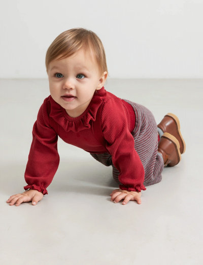 Long-sleeved bodysuit with a ruffle collar and ruffle trim on the sleeves. The bodysuit has snap buttons between the legs for easy diaper changes.