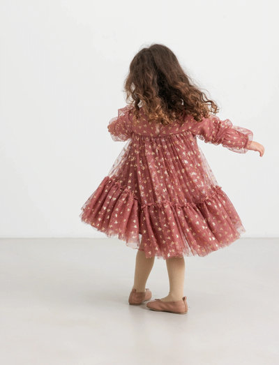 Long-sleeved tulle dress with lots of volume and a soft cotton lining. The dress is adorned with gold bows, has a back button closure, and goes above the knee.