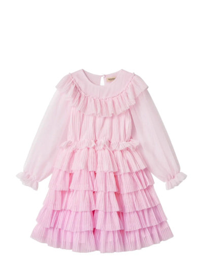 Festive long-sleeved dress in lightweight, pleated tulle with multiple layers. The dress fastens with buttons at the back. The lenght of the dress goes above the knee.