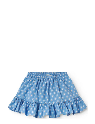 Skirt with a wide ruffle hem and an elastic waistband that ensures a comfortable fit. The skirt goes above the knee.
