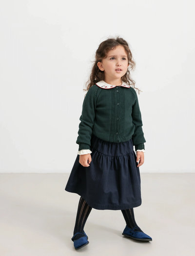 Skirt with a flared silhouette, elastic waistband, and a shaped yoke that adds a lovely fit. The skirt goes below the knee.