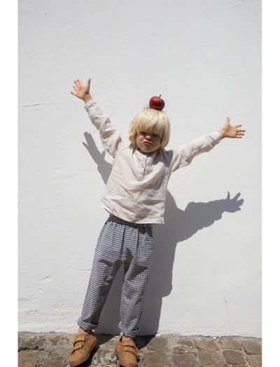 Long-sleeved mao shirt with button closure at the front.