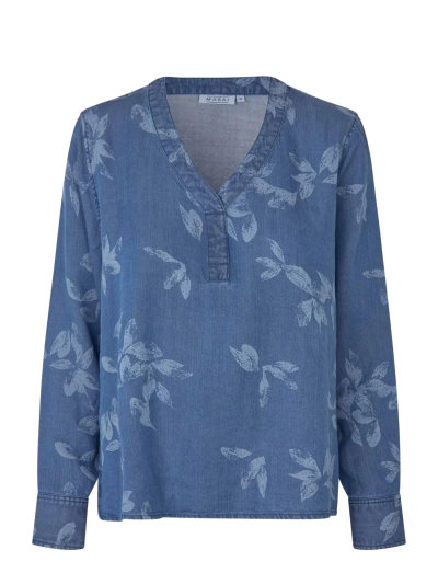Denna långärmade blus är tillverkad med ett subtilt bladtryck och har en avslappnad silhuett. V-ringningen ger en elegant touch, vilket gör den lämplig för både avslappnade och mer uppklädda tillfällen. En mångsidig beklädnadsdel som kan användas ensam eller i lager.