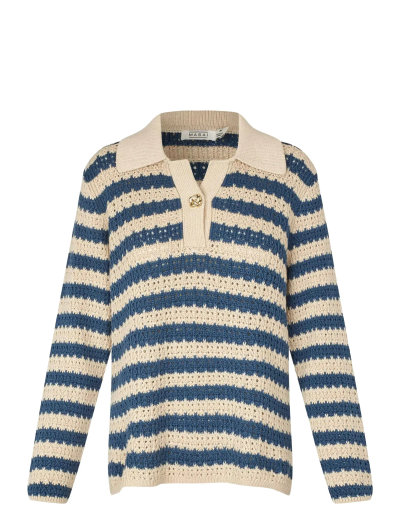 Denna pullover har en texturerad stickning och en elegant krage, vilket ger en raffinerad men avslappnad look. De horisontella ränderna tillför ett visuellt intressant element, medan den knappförsedda slåen ger en anpassningsbar halsringning.
