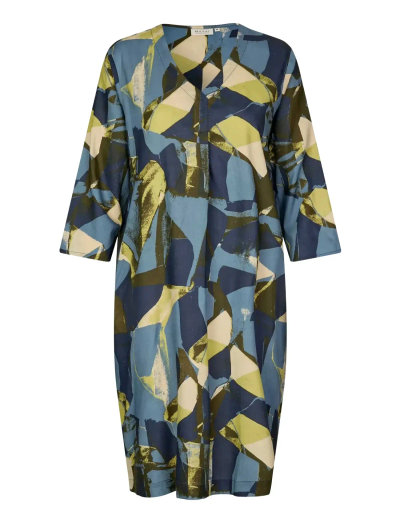 Med en avslappnad silhuett erbjuder denna klänning enkel stil och komfort. Det abstrakta trycket ger en modern touch, vilket gör den till ett mångsidigt val för olika tillfällen. De trekvartslånga ärmarna ger täckning samtidigt som de behåller en lätt och luftig känsla.