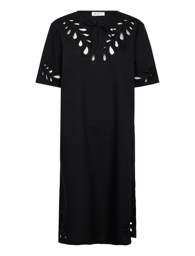 Iögonfallande utskärningar pryder denna maxiklänning och ger en touch av luftig elegans. Den avslappnade silhuetten och de korta ärmarna gör den idealisk för varmt väder, medan den fina knytdetaljen i halsen ger en subtil, feminin touch. Perfekt för en avslappnad sommarstil.