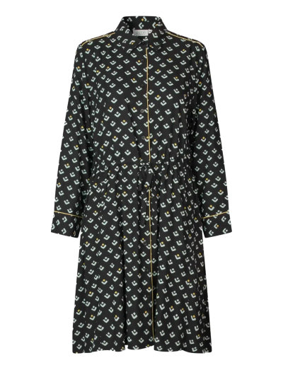 Denna skjortklänning har knäppning fram och ett knytband i midjan, vilket ger en smickrande silhuett. De långa ärmarna och midilängden gör den till ett mångsidigt val för olika tillfällen.