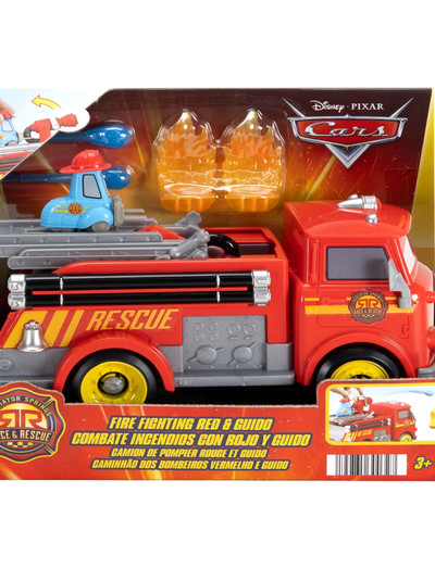 Det uppstår en brand under Kylarköpings rallytävling 200 och Red och Guido måste skynda till platsen. Väl framme kan barnen dra den icke avtagbara Guido-figuren bakåt för att få fram en vattenkanon som de kan ladda med vattenprojektiler. Sikta på de medföljande bränderna, tryck ner spaken och skicka iväg projektilerna för att släcka bränderna! Hylla två av fansens favoritkaraktärer som nu har blivit hjältar! Två bränder och två vattenprojektiler medföljer. Färger och dekorationer kan variera.TRADE QUOTE SHEET COPY ONLY. NAMN OCH PRODUKTER KAN ÄNDRAS. VÄNTAR PÅ SLUTLIGT GODKÄNNANDE. Återskapa berättelser från Disney och Pixars Bilar-filmer och -serier med det här leksetet, inspirerat av franchisen och barnens favorithjältar.