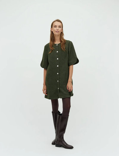 Denna korta klänning har en knappslå framtill och erbjuder en blandning av klassisk stil och modern design. Klänningen är designad med korta, vida ärmar som ger silhuetten en unik touch. Dess rena linjer och minimalistiska estetik gör den till ett mångsidigt tillskott till varje garderob.