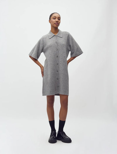 Knäppstickad klänning med krage och korta ärmar. Denna mångsidiga modell kan användas som klänning eller öppen kofta.