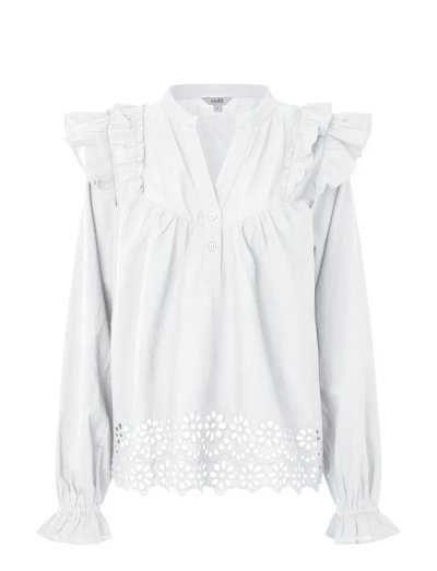 Volangdetaljer vid axlarna ger en lekfull elegans till denna långärmade blus. Designen har även en V-ringning och fina blomsterutskärningar längs fållen, vilket förstärker dess feminina uttryck.