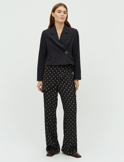Dessa byxor har en smickrande rak passform och erbjuder en bekväm passform och en stilren silhuett. Omlottdetaljen ger en touch av sofistikering, vilket gör dem lämpliga för både vardagliga och mer uppklädda tillfällen.