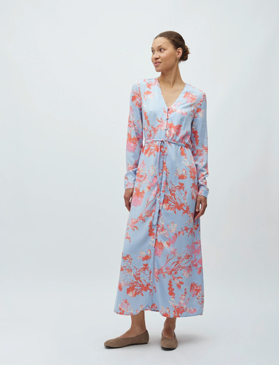 Denna maxiklänning har ett knytband i midjan för anpassad passform och en smickrande silhuett. Den långärmade designen och knäppningen framtill ger en sofistikerad touch, vilket gör den lämplig för olika tillfällen.