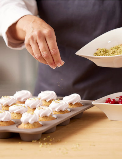 Silikonform med stabiliserande stålkant. Används till exempelvis små dessertbottnar, småfrallor till matsäcken, som formar för glass eller smarriga muffins. Tål maskindisk, ugn (max 220 °C) och frys (max -20 °C).