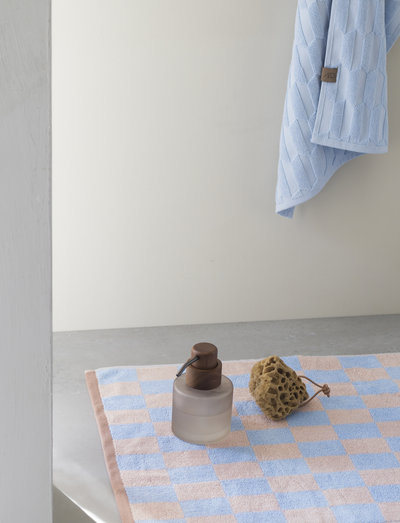 Ge ditt badrum lite extra kant och karaktär med badmattan RETRO från Mette Ditmer. Den här snygga badmattan har en klassisk grön och dammigt grönrutig färgkombination som ger en frisk fläkt till din inredning. Den grafiska looken fulländas av en puderrosa kant och en orange etikett och rem för en unik och modern touch.